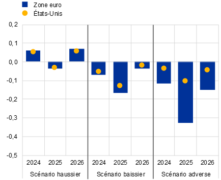 Notes : Les scénarios sont simulés à travers le modèle mondial de la BCE avec des politiques monétaires exogènes pour la zone euro/les États-Unis.