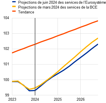 a) Projections de juin 2024 établies par les services de l’Eurosystème | b) Révisions par rapport aux projections de mars 2024 établies par les services de la BCE |
