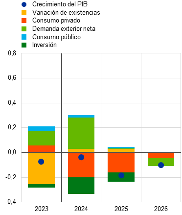 En comparación con las proyecciones de junio de 2024, el crecimiento del PIB real se ha revisado a la baja en 0,1 puntos porcentuales para cada uno de los años del horizonte de proyección (cuadro 3 y gráfico 2). Los datos históricos del PIB real se corrigieron al alza para el segundo semestre de 2023, lo que se tradujo en un efecto de arrastre mayor a 2024, que, sin embargo, quedó compensado con creces por las revisiones a la baja de las tasas de crecimiento trimestrales para 2024. En lo que respecta a los componentes, las proyecciones relativas al consumo privado y la inversión se han revisado a la baja para 2024. Aunque la demanda exterior neta se ha corregido al alza (para reflejar, sobre todo, la evolución de los datos publicados), el crecimiento de las exportaciones en el segundo semestre de 2024 se ha revisado a la baja debido a los persistentes problemas de competitividad. La corrección a la baja para 2025 se debe exclusivamente a los efectos de arrastre derivados de las revisiones en el segundo semestre de 2024. En cambio, en el caso de 2026, la variación obedece fundamentalmente a una revisión a la baja del crecimiento del consumo privado, que refleja una recuperación del consumo algo más débil de lo previsto, así como cierta corrección a la baja de la contribución de la demanda exterior neta.