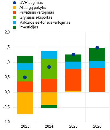 Pastabos: duomenys pakoreguoti dėl sezoniškumo ir darbo dienų skaičiaus. Istoriniai duomenys gali skirtis nuo pateiktų naujausiose Eurostato publikacijose, nes dalis duomenų buvo paskelbta po galutinės duomenų įtraukimo šioms prognozėms rengti dienos. Vertikalia linija pažymėta prognozių laikotarpio pradžia. Korekcijos apskaičiuotos remiantis nesuapvalintais skaičiais. Remiantis suapvalintais rodikliais, realiojo BVP augimo prognozė kiekvieniems prognozių laikotarpio metams sumažinta –0,1 procentinio punkto.