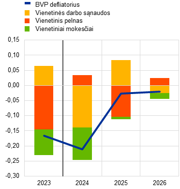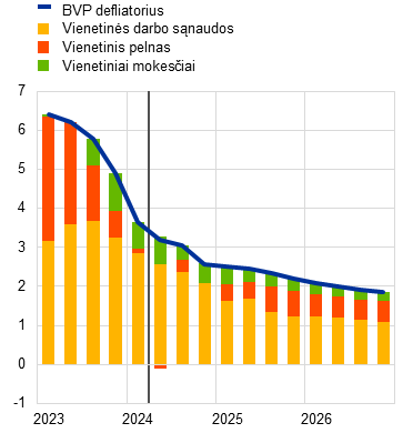 Prognozuojama, kad vidaus kainų spaudimas, matuojamas pagal BVP defliatoriaus augimą, toliau mažės, o pelno augimas iš pradžių švelnins aukštų darbo sąnaudų spaudimą, bet vėliau atsigaus (žr. 12 pav.). BVP defliatoriaus metinis augimo tempas pastaraisiais ketvirčiais labai sumažėjo – 2024 m. antrąjį ketvirtį buvo 3,2 %[11]. Prognozuojama, kad šis augimas lėtės visus 2024 m., 2024 m. vidutiniškai bus 3,1 %, vėliau mažės nuosaikiau ir 2026 m. sudarys vidutiniškai 2,0 %. Vienetinio pelno augimas aukščiausią lygį pasiekė 2022 m. pabaigoje, o 2024 m. antrąjį ketvirtį tapo neigiamas[12]. Vienetinio pelno augimas turėtų būti mažesnis už vienetinių darbo sąnaudų augimą visus 2024 m., o tai rodo, kad pelno maržomis švelninamas palyginti spartus darbo sąnaudų augimas. Kadangi vienetinių darbo sąnaudų augimas lėtėja, o kitų gamybos veiksnių sąnaudų augimas taip pat yra nedidelis, nuo 2025 m. vienetinio pelno augimas turėtų šiek tiek atsigauti. Prie jo atsigavimo prisideda ekonomikos atsigavimas ir spartėjantis našumo augimas. Palyginti su 2024 m. birželio mėn. prognozėmis, 2024 m. BVP defliatoriaus augimo prognozė sumažinta, tačiau 2025 ir 2026 m. nepakeista. 2024 m. vienetinio pelno prognozė šiek tiek padidinta, o 2025 m. sumažinta 0,3 procentinio punkto, atsverdama vienetinių darbo sąnaudų prognozės sumažinimą 2024 m. ir nedidelį padidinimą 2025 m.