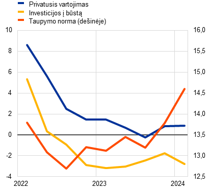Nors pastaruoju metu privatusis vartojimas buvo vangus, vis dar numatoma, kad vidutiniu laikotarpiu jis bus pagrindinis augimą skatinsiantis veiksnys, nes kylant darbo užmokesčiui ir mažėjant infliacijai jį palaikys spartus atlygio už darbą augimas. 2024 m. pirmąjį pusmetį privačiojo vartojimo augimas nuvylė, nes didesnės, negu tikėtasi, su darbo santykiais nesusijusios pajamos lėmė didesnį, negu tikėtasi, taupymo padidėjimą, palyginti su birželio mėn. prognozėmis. Tačiau namų ūkių išlaidų augimas nuo 2023–2024 m. fiksuoto maždaug 0,8 % lygio 2025–2026 m. turėtų pakilti iki maždaug 1,5 %., t. y. gerokai daugiau už iki pandemijos buvusį vidurkį – 1,2 %. Šį atsigavimą skatina didėjančios realiosios disponuojamosios pajamos, kurių augimą daugiausia skatina sparčiai kylantis darbo užmokestis ir didelės, nors ir mažėjančios, su darbo santykiais nesusijusios pajamos (ypač pajamos iš savarankiško darbo ir finansinio turto). Prognozuojama, kad vidutiniu laikotarpiu, sustojus realiojo darbo užmokesčio augimui, realiosios pajamos augs lėčiau. Tuo pačiu metu 2025–2026 m. numatomas neapibrėžtumo sumažėjimas turėtų skatinti privačiojo vartojimo augimą, o dėl to, pamažu normalizuojantis vartotojų išlaidų įpročiams, turėtų mažėti ir taupymo norma. Palyginti su 2024 m. birželio mėn. prognozėmis, privačiojo vartojimo augimo 2024 m. prognozė sumažinta 0,4 procentinio punkto. Tam įtakos turėjo mažesnė, negu tikėtasi, pirmųjų dviejų ketvirčių dinamika ir lėtesnis vėlesnis atsigavimas – šios tendencijos tęsis ir 2025 m. Todėl, atsižvelgiant į kiek lėtesnio realiųjų disponuojamųjų pajamų augimo poveikį ir numatomą lėtesnį namų ūkių išlaidų normalizavimąsi, 2025 m. prognozė sumažinta 0,3 procentinio punkto. Šis lėtesnis normalizavimas taip pat yra pagrindinis veiksnys, dėl kurio 0,1 procentinio punkto sumažinta 2026 m. prognozė. Šios korekcijos atitinka rodiklius, gautus iš Europos Komisijos apklausų apie vartotojų ateinančių 12 mėnesių taupymo lūkesčius, iš kurių matyti, kad taupymo lūkesčiai pastaraisiais ketvirčiais toliau didėjo.