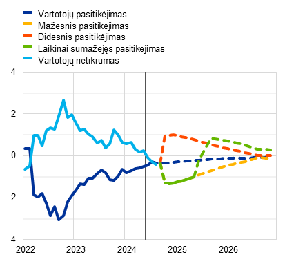 Pastabos: b grafike visos turimos imties duomenys yra standartizuoti: pasitikėjimo duomenys – nuo 1999 m. sausio mėn. iki 2024 m. rugpjūčio mėn., netikrumo duomenys – nuo 2019 m. balandžio mėn. iki 2024 m. liepos mėn. Punktyrine mėlyna linija pažymėta vartotojų pasitikėjimo prognozė pagal pagrindinį scenarijų, parengta taikant B pav. aprašytą empirinį modelį. Pavyzdyje pavaizduoti alternatyvūs vartotojų pasitikėjimo raidos scenarijai aprašyti toliau. B grafike vertikalia linija pažymėta šio prognozių laikotarpio pradžia. Naujausi stebėjimo duomenys a grafike yra 2024 m. pirmojo ketvirčio duomenys, b grafike – 2024 m. rugpjūčio mėn. duomenys.