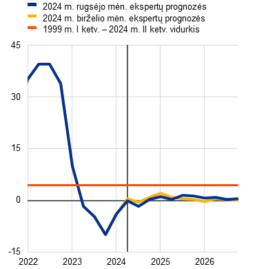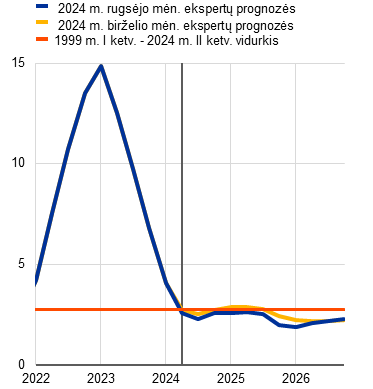 Šaltiniai: Consensus Economics prognozės, 2024 m. rugpjūčio 15 d. (2026 m. duomenys – iš 2024 m. liepos mėn. apklausos); ECB profesionaliųjų prognozuotojų apklausa, 2024 m. liepos 19 d.; TVF pasaulio ekonomikos perspektyvos vertinimas, 2024 m. liepos 16 d.; Europos Komisijos 2024 m. pavasario ekonominė prognozė, 2024 m. gegužės 15 d.; EBPO ekonominės perspektyvos vertinimas, 2024 m. gegužės 2 d.