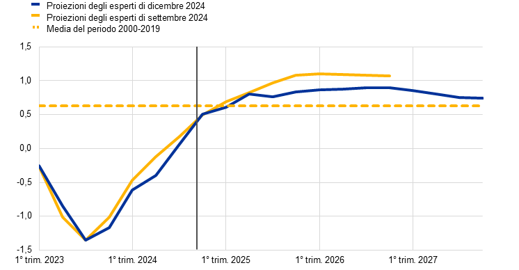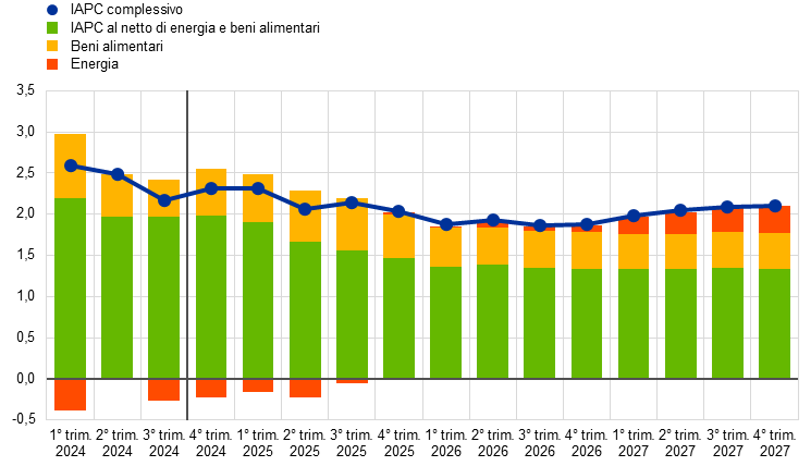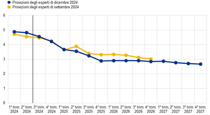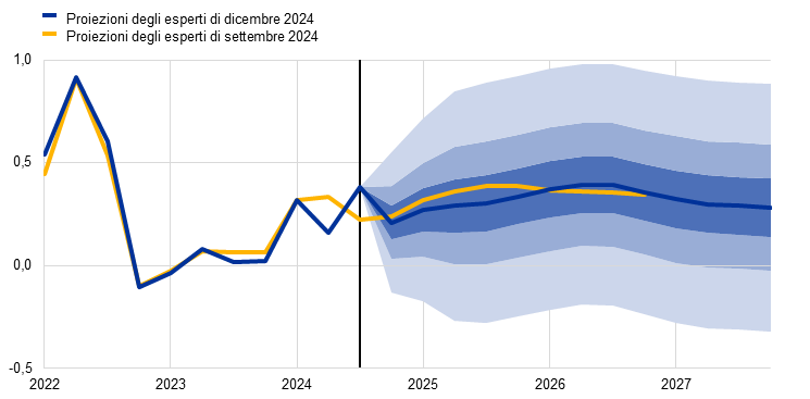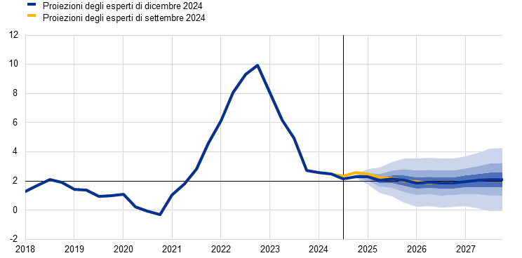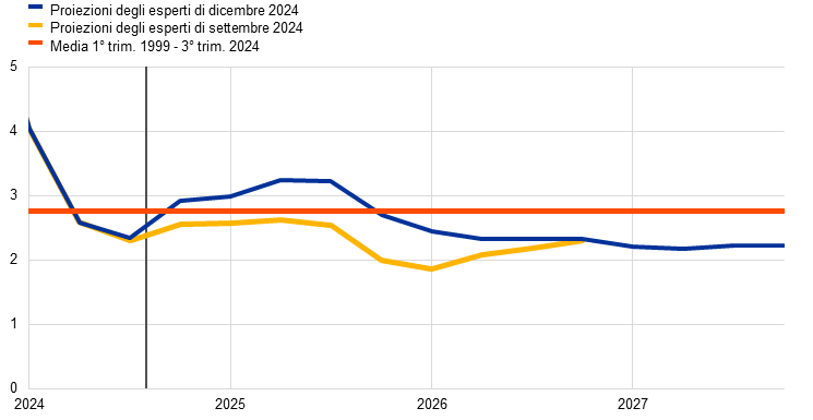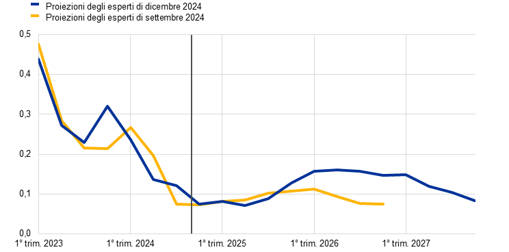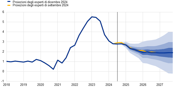 Proiezioni degli esperti dell’Eurosistema | dicembre 2024 | 0,7 | 1,1 | 1,4 | 1,3 | 2,4 | 2,1 | 1,9 | 2,1 | 2,9 | 2,3 | 1,9 | 1,9 |