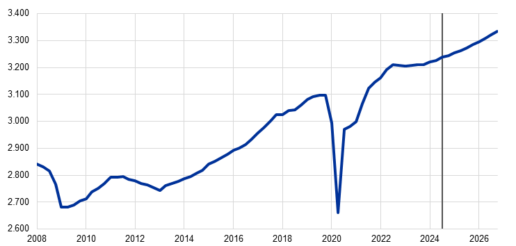 Secondo la pubblicazione dell’Eurostat del 6 dicembre, successiva all’ultimazione delle proiezioni di dicembre 2024, nel terzo trimestre del 2024 la crescita del reddito per occupato è stata pari al 4,4%.