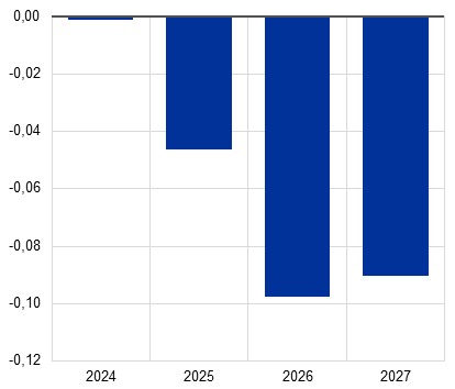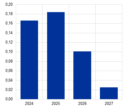 Si stima che l’impatto sulla crescita esercitato dal passato inasprimento della politica monetaria venga meno nel periodo in esame, grazie al perdurante calo dei tassi di interesse di riferimento. L’impatto delle misure di politica monetaria adottate fra dicembre 2021 e settembre 2023 continua a trasmettersi all’economia reale. Tuttavia, gran parte dell’effetto al ribasso sulla crescita dovrebbe essersi già manifestata. A seguito delle riduzioni dei tassi di riferimento attuate da giugno 2024, e sulla base delle aspettative di mercato circa l’evoluzione futura dei tassi di interesse alla data dell’ultimo aggiornamento delle proiezioni (riquadro 1), ci si attende che l’effetto negativo sulla crescita economica proveniente dal passato inasprimento della politica monetaria venga meno nel 2025. Anche se l’entità e i tempi di tale impatto negativo sono notevolmente incerti, si ritiene che risulti esaurito entro il 2026.