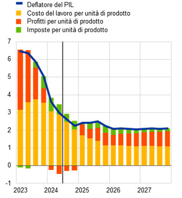 Nel complesso le pressioni interne sui prezzi, misurate dalla crescita del deflatore del PIL, dovrebbero continuare a diminuire in un contesto in cui i margini di profitto attenuano le spinte dal lato del costo del lavoro nel breve periodo (grafico 12). Secondo le stime il tasso di variazione annua del deflatore del PIL sarebbe sceso rapidamente nel 2024, collocandosi al 2,9% in media d’anno (dal 5,9% nel 2023), ma si prevede che diminuisca a un ritmo più graduale nel periodo considerato attestandosi su una media del 2,1% nel 2027. La crescita dei profitti per unità di prodotto continuerebbe ad assorbire la dinamica relativamente vigorosa del costo del lavoro, ma soltanto a breve termine[21]. Con la moderazione del tasso di incremento del costo del lavoro per unità di prodotto e la crescita ancora contenuta dei costi degli altri input, i margini di profitto dovrebbero mettere a segno un lieve recupero a partire dal 2025 grazie alla ripresa economica e all’accelerazione della produttività e quindi tornerebbero da tale anno a fornire un contributo positivo alle pressioni dal lato dei prezzi interni. Nel confronto con l’esercizio previsivo del settembre scorso, la crescita del deflatore del PIL ha subito una lieve revisione al ribasso per il 2024, è invariata per il 2025 ed è stata corretta leggermente al rialzo per il 2026. Il tasso di variazione dei margini di profitto è stato oggetto di una lieve correzione verso il basso per il 2024 e verso l’alto per il 2025 e il 2026, che ha in larga parte compensato le corrispondenti revisioni al rialzo e al ribasso per la crescita del costo del lavoro per unità di prodotto.