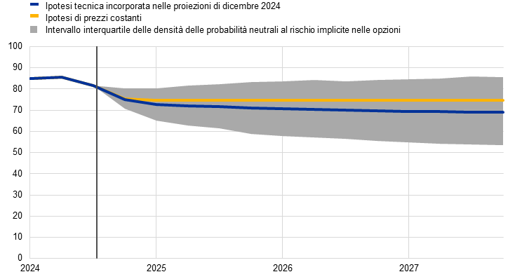 Rispetto all’esercizio dello scorso settembre, le principali modifiche apportate alle ipotesi tecniche sono rappresentate da prezzi più bassi per il petrolio e l’elettricità ma più elevati per il gas, da un indebolimento del tasso di cambio e dal calo dei tassi di interesse. Le ipotesi concernenti i prezzi del petrolio e dell’elettricità, fondate sulle quotazioni dei contratti future, sono state riviste lievemente verso il basso, mentre quelle relative al gas sono state corrette al rialzo per il 2025 e leggermente al ribasso per il 2026. Si ipotizza che i corsi dell’energia diminuiscano nell’orizzonte temporale di proiezione. Le quotazioni delle materie prime non energetiche sono state riviste considerevolmente al rialzo per il 2025 e lievemente al ribasso per il 2026. Il tasso di cambio dell’euro si è deprezzato del 3,0% sul dollaro statunitense e dell’1,3% in termini effettivi nominali e si assume che rimanga costante nel periodo in esame. Sulla base delle aspettative di mercato, le ipotesi per i tassi di interesse a breve termine sono state corrette verso il basso di 20-30 punti base nel periodo 2025-2026, mentre quelle relative ai rendimenti obbligazionari a lungo termine sono state riviste lievemente verso l’alto.