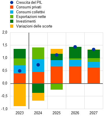Nel medio periodo il PIL in termini reali registrerebbe un’accelerazione grazie alla ripresa dei consumi, al rafforzamento della domanda esterna e all’esaurirsi degli effetti frenanti esercitati dal precedente inasprimento della politica monetaria (tavola 3). Il perdurante aumento del potere di acquisto delle famiglie, dovuto alla tenuta della crescita salariale e al calo dell’inflazione, dovrebbe sostenere la dinamica dei consumi privati. La spesa delle famiglie continuerebbe a sorreggere la ripresa nel medio periodo (grafico 2, pannello a), sebbene in misura lievemente inferiore rispetto a quanto previsto nelle proiezioni di settembre. La complessiva tenuta del mercato del lavoro e l’ipotizzata ripresa graduale del clima di fiducia dei consumatori costituirebbero altresì dei fattori a sostegno dei consumi privati nonostante il perdurare di forti incentivi al risparmio, compresa la presenza di tassi di interesse tuttora elevati e di criteri di concessione del credito ancora stringenti. Gli investimenti si rafforzerebbero gradualmente nell’orizzonte temporale di proiezione, riflettendo principalmente il venir meno dell’azione frenante esercitata dal precedente inasprimento della politica monetaria e il sostegno fornito dall’aumento degli utili unitari, dall’impiego di fondi nell’ambito del programma NGEU e dal miglioramento della domanda interna ed esterna. Quest’ultimo andamento rafforzerebbe altresì la dinamica delle esportazioni nonostante i problemi di competitività dell’area dell’euro. L’intonazione delle politiche di bilancio sarebbe maggiormente restrittiva nel 2024 e sostanzialmente neutra nel periodo 2025‑2026. Verso la fine dell’arco di tempo considerato si prevede che registri un nuovo inasprimento, contribuendo a una decelerazione del PIL nel 2027 (sezione 4).