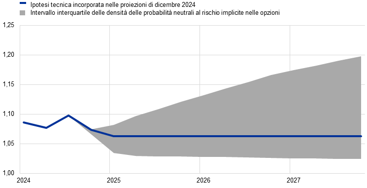 La presente analisi di sensibilità valuta le implicazioni di profili alternativi del tasso di cambio per lo scenario di base delle proiezioni. Le ipotesi tecniche per i tassi di cambio nello scenario di base delle proiezioni sono mantenute costanti nel periodo in esame. Un profilo alternativo al ribasso e uno al rialzo sono stati calcolati con il 25° e il 75° percentile delle densità delle probabilità neutrali al rischio implicite nelle opzioni per il tasso di cambio dollaro/euro al 20 novembre 2024 (grafico 14). Gli effetti di questi profili alternativi sono valutati utilizzando modelli macroeconomici della BCE e dell’Eurosistema. L’impatto medio sulla crescita del prodotto e sull’inflazione risultante da tali modelli è mostrato nella tavola 7.