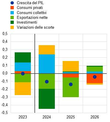 Rispetto alle proiezioni dello scorso settembre, la crescita del PIL in termini reali è stata rivista verso il basso per il periodo 2024-2026 (tavola 3 e grafico 2, pannello b). Le correzioni al ribasso per il periodo 2024-2025 riflettono un indebolimento degli investimenti (riconducibile soprattutto alle revisioni dei dati relativi alla prima metà del 2024) e delle esportazioni (nette) nel breve periodo, a causa dei perduranti problemi di competitività. Ciò è compensato in parte nel 2024 dal considerevole rafforzamento dei consumi collettivi. Anche il tasso di espansione dei consumi privati è stato corretto verso il basso per il periodo 2025-2026 a causa di una rivalutazione delle attese circa i tempi di normalizzazione del saggio di risparmio rispetto agli elevati livelli attuali.