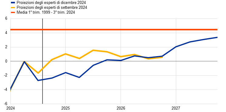 a) Proiezioni di dicembre 2024 | b) Revisioni rispetto alle proiezioni di settembre 2024 |