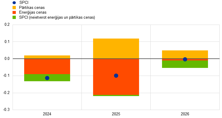 Paredzams, ka kopējā SPCI inflācija 2024. gada beigās pieaugs, bet pēc tam, sākot ar 2025. gada 2. ceturksni, svārstīsies ap ECB noteikto 2 % inflācijas mērķi. Gaidāms, ka enerģijas komponenta bāzes efekti būs galvenais faktors, kas noteiks īslaicīgo inflācijas kāpumu iespēju aplēšu perioda sākumā. Pamatojoties uz pieņēmumiem par naftas un gāzes cenu kritumu, enerģijas cenu inflācija, visticamāk, saglabāsies negatīva līdz 2025. gada 2. pusgadam un pēc tam joprojām būs mērena, izņemot 2027. gadu, kad tā pieaugs sakarā ar jaunu klimata pārmaiņu mazināšanas pasākumu ieviešanu. Paredzams, ka pārtikas cenu inflācija līdz 2025. gada vidum palielināsies, un to galvenokārt noteiks neapstrādātās pārtikas cenu dinamikas atjaunošanās, bet pēc tam līdz 2027. gadam saruks līdz vidēji 2.2 %. Gaidāms, ka SPCI inflācija (neietverot enerģijas un pārtikas cenas; SPCIX) 2025. gada sākumā saruks, izzūdot agrāko enerģijas cenu šoku netiešajai ietekmei, mazinoties darbaspēka izmaksu spiedienam un agrāk īstenotās stingrās monetārās politikas pasākumu novēlotajai ietekmei turpinot ietekmēt patēriņa cenas. Gaidāms, ka šo kritumu noteiks sarūkošā pakalpojumu cenu inflācija, kas līdz šim bijusi samērā noturīga. Kopumā gaidāms, ka SPCIX inflācija samazināsies no 2.9 % 2024. gadā līdz 1.9 % 2027. gadā. Sākotnēji darba samaksas kāpums joprojām būs paaugstināts, bet pakāpeniski samazināsies, izzūdot inflācijas kompensācijas spiedienam. Gaidāms, ka sakarā ar lēnāku atlīdzības vienam nodarbinātajam pieaugumu un darba ražīguma kāpuma atjaunošanos vienības darbaspēka izmaksas augs ievērojami lēnāk. Tāpēc paredzams, ka iekšzemes cenu spiediens mazināsies, peļņas maržām sākotnēji amortizējot joprojām lielo darbaspēka izmaksu spiedienu, bet iespēju aplēšu periodā atveseļojoties. Ārējam cenu spiedienam kopumā vajadzētu saglabāties mērenam. Salīdzinājumā ar 2024. gada septembra iespēju aplēsēm kopējās SPCI inflācijas perspektīva 2024. un 2025. gadam koriģēta un nedaudz pazemināta galvenokārt sakarā ar pārsteidzoši zemajiem rādītājiem un pieņēmumiem par naftas un elektroenerģijas cenu kritumu.