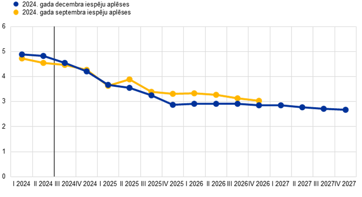 Avots: OECD Tautsaimniecības perspektīvas, publicētas 2024. gada 4. decembrī, datu aktualizēšanas pēdējais termiņš – 2024. gada 27. novembris; Consensus Economics prognozes, 2024. gada 14. novembris attiecībā uz 2024.–2025. gadu (2026. un 2027. gada dati ņemti no 2024. gada oktobra apsekojuma); ECB aptauja Survey of Professional Forecasters, publicēta 2024. gada 21. oktobrī; SVF Pasaules tautsaimniecības perspektīva, datu aktualizēšanas pēdējais termiņš – 2024. gada 22. oktobris; Eiropas Komisijas 2024. gada rudens ekonomiskā prognoze, datu aktualizēšanas pēdējais termiņš – 2024. gada 21. oktobris.