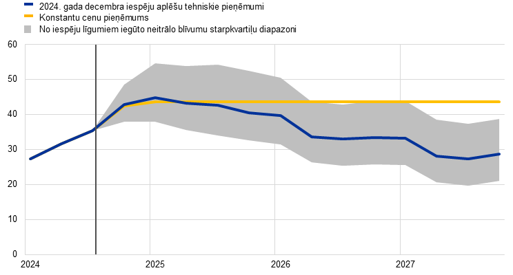 Piezīmes. Līmeņu korekcijas izteiktas procentos un pieauguma tempa un gada procentuālo rādītāju korekcijas – procentu punktos. Izaugsmes tempa un procentu likmju korekcijas aprēķinātas, izmantojot skaitļus, kas noapaļoti līdz vienam ciparam aiz komata, savukārt korekcijas, kas uzrādītas kā procentuālās pārmaiņas, aprēķinātas, izmantojot nenoapaļotus skaitļus. Tehniskie pieņēmumi par eurozonas procentu likmēm un izejvielu cenām balstīti uz tirgus gaidām atbilstoši stāvoklim 2024. gada 20. novembrī. Naftas cenas ir Brent jēlnaftas tagadnes darījumu cenas un biržā tirgoto nākotnes līgumu cenas. Gāzes cenas ir Nīderlandes biržas gāzes tagadnes darījumu cenas un biržā tirgoto nākotnes līgumu cenas. Elektroenerģijas cenas ir piecu lielāko eurozonas valstu vidējās vairumtirdzniecības tagadnes darījumu cenas un biržā tirgoto nākotnes līgumu cenas. ETS1 kvotu (EUA) "sintētiskā" biržā tirgoto nākotnes līgumu cena atvasināta kā divu tuvāko Eiropas Enerģijas biržas EUA nākotnes līgumu lineāri interpolētā vērtība mēneša beigās. Pēc tam tiek noteiktas EUA biržā tirgoto nākotnes līgumu mēneša vidējās cenas, lai iegūtu gada rādītāja ekvivalentu. Tā kā ETS2 kvotas netiek tirgotas, Eurosistēmas speciālistu pieņēmumus par šīm cenām veido robežcena, virs kuras tiks atbrīvotas papildu kvotas, un šī cena aktualizēta atbilstoši 2027. gada cenām (sīkāku informāciju sk. 2. ielikumā). Uz izejvielu cenu tendencēm norāda biržā tirgoto nākotnes darījumu tirgi 10 darbadienu laikā pirms pēdējā datu aktualizēšanas termiņa. Tiek pieņemts, ka divpusējie valūtu kursi iespēju aplēšu periodā nemainīsies un būs atbilstoši vidējiem rādītājiem, kuri dominēja 10 darbadienu periodā, kas beidzās pēdējā datu aktualizēšanas dienā. Pieņēmumi par eurozonas valstu valdības 10 gadu obligāciju nominālajām ienesīguma likmēm balstās uz valstu 10 gadu obligāciju vidējām ienesīguma likmēm, kas svērtas ar IKP gada rādītājiem. Ja pieejami nepieciešamie dati, konkrētu valstu valdības 10 gadu obligāciju nominālās ienesīguma likmes tiek definētas kā 10 gadu etalonobligāciju ienesīguma likmes, ko pielāgo, izmantojot biržā netirgoto nākotnes līgumu nominālās ienesīguma likmes, kas pēdējā datu aktualizēšanas termiņā iegūtas no atbilstošajām attiecīgo valstu ienesīguma līknēm. Pārējām valstīm attiecīgās valsts 10 gadu obligāciju ienesīguma likmes tiek definētas kā 10 gadu etalonobligāciju ienesīguma likme, ko pielāgo, izmantojot nemainīgu uzcenojumu (kas novērots pēdējā datu aktualizēšanas termiņā) virs eurozonas bezriska ilgtermiņa procentu likmes tehniskā pieņēmuma.
