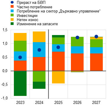 Очаква се продължителната значителна геополитическа и свързана с политиките несигурност да възпира икономическия растеж в еврозоната и да забавя очакваното възстановяване. Това се дължи на малко по-слаб от предвиденото растеж в края на 2024 г. Несигурността, свързана както с вътрешни, така и с търговски политики, е висока. Макар базовата прогноза да включва единствено последиците от нови мита върху търговията между САЩ и Китай, се допуска, че отрицателното въздействие от несигурността във връзка с възможни други промени в търговските политики в глобален мащаб, особено спрямо Европейския съюз, влияе неблагоприятно на износа и инвестициите на еврозоната. В съчетание с непреодолените трудности на еврозоната, свързани с конкурентоспособността, това се очаква да доведе до по-нататъшно свиване на пазарния дял на нейния износ. Въпреки тези неблагоприятни фактори се запазват условията за ново засилване на растежа на БВП в еврозоната в рамките на прогнозния период. Очаква се нарастването на реалните заплати и заетостта на фона на силен, макар и отбелязващ охлаждане, пазар на труда да допринесе за възстановяване, при което основен двигател на растежа ще продължи да бъде потреблението. Вътрешното търсене би трябвало да бъде подкрепено и от разхлабване на условията за финансиране в съответствие с пазарните очаквания за бъдещото развитие на лихвените проценти. Би трябвало пазарът на труда да остане устойчив, а равнището на безработица да бъде средно 6,3% през 2025 г. и да спадне до 6,2% през 2027 г. С постепенното отзвучаване на някои циклични фактори, които неотдавна доведоха до спад на производителността, през прогнозния период се очаква тя да се повиши въпреки продължаващото наличие на структурни предизвикателства. Като цяло се предвижда средният годишен прираст на реалния БВП да бъде 0,9% през 2025 г. и да се засили до 1,2% през 2026 г. и 1,3% през 2027 г. В сравнение с макроикономическите прогнози на експертите на Евросистемата от декември 2024 г. перспективата за растежа на БВП е ревизирана надолу с 0,2 процентни пункта за 2025 г. и 2026 г., но остава непроменена за 2027 г. По-слабата перспектива се дължи главно на ревизирани надолу стойности на износа и, в по-малка степен, на инвестициите. Тя отразява по-силно от допусканото преди въздействие на несигурността, както и очакванията, че свързаните с конкурентоспособността трудности вероятно ще се запазят по-дълго.[1]