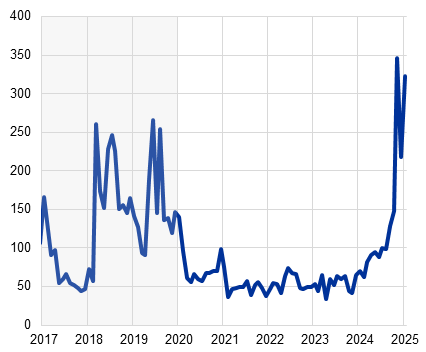 Dynamika światowego wzrostu gospodarczego pod koniec 2024 przejściowo się zwiększyła, ale polityka handlowa prowadzona ostatnio przez Stany Zjednoczone pociąga za sobą czynniki spowalniające[2]. W czwartym kwartale 2024 światowy wzrost gospodarczy przyspieszył, zasadniczo zgodnie z projekcjami z grudnia 2024, w miarę jak bodźce fiskalne pobudzały aktywność gospodarczą w Chinach, a wysokie wydatki gospodarstw domowych podtrzymywały dynamikę realnego PKB w USA. Napływające dane wskazują na nieznaczne osłabienie światowego wzrostu gospodarczego w pierwszym kwartale 2025. W sektorze usług, który w drugim półroczu 2024 był motorem wzrostu, widać wczesne oznaki spowolnienia, natomiast sektor przetwórstwa przemysłowego pozostaje słaby. Ponadto od listopada 2024 niepewność co do polityki handlowej gwałtownie wzrosła w obliczu komunikatów Stanów Zjednoczonych dotyczących ceł. Oczekuje się, że będzie to oddziaływać hamująco na inwestycje na świecie.