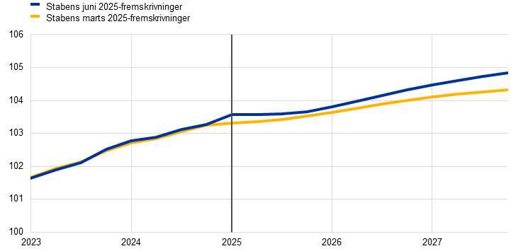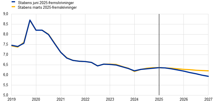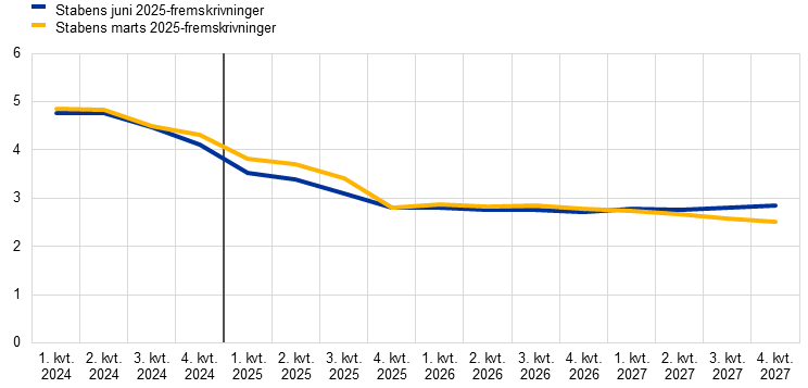 Den samlede inflation, målt ved det harmoniserede forbrugerprisindeks (HICP), vil sandsynligvis holde sig under 2 pct. på kort sigt, men den forventes igen at nå målet på mellemlangt sigt. Inflationen forventes at falde i løbet af 2025 og nå et lavpunkt på 1,4 pct. i 1. kvartal 2026, inden den igen stiger til 2,0 pct. i 2027. Nedgangen i den samlede inflation i løbet af 2025 skyldes til dels en negativ energiinflation efter det seneste fald i oliepriserne og engrospriserne på naturgas. Energiinflationen ventes at forblive negativ indtil 2027, hvor nye foranstaltninger til modvirkning af klimaændringer træder i kraft i forbindelse med det nye emissionshandelssystem (ETS2). Efter en midlertidig stigning i 2. kvartal 2025 forventes fødevareinflationen at falde til lidt over 2 pct. i 2027. HICP-inflationen ekskl. energi og fødevarer (HICPX) forventes at falde som følge af tjenesteydelseskomponenten, efterhånden som virkningen af forsinkede prisjusteringer for nogle varer aftager, lønpresset aftager, og lavere energipriser slår igennem i priskæden. Lønvæksten ventes fortsat at følge den nedadgående tendens, efterhånden som presset for at genvinde tidligere tab af realløn aftager. Sammen med en genopretning af produktivitetsvæksten forventes dette at føre til en betydeligt langsommere vækst i enhedslønomkostningerne. Det eksterne prispres, som afspejles i importpriserne, forventes at forblive moderat, idet det antages, at EU's toldpolitik forbliver uændret med et vist nedadrettet pres fra den stærkere euro og faldet i råvarepriserne på energi i de seneste måneder. Sammenlignet med fremskrivningerne fra marts 2025 er udsigterne for den samlede HICP-inflation blevet nedjusteret med 0,3 procentpoint for både 2025 og 2026 på grund af antagelserne om lavere råvarepriser på energi og apprecieringen af euroen, mens de ikke er justeret for 2027.