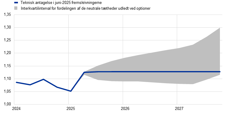Sammenlignet med fremskrivningerne fra marts 2025 er de vigtigste ændringer af de tekniske antagelser markant lavere råvarepriser, en betydeligt stærkere eurokurs og højere lange renter. Antagelserne om oliepriserne er blevet nedjusteret med næsten 11 pct. for 2025-26, idet oliepriserne falder yderligere på kort sigt, inden de stiger svagt fra begyndelsen af 2026, hvilket indebærer et opadrettet pres på inflationen i 2027. Antagelsen om engrospriserne på gas er blevet nedjusteret med 24,4 pct. for 2025, med 17,6 pct. for 2026 og med 7,7 pct. for 2027. Euroen er apprecieret med 8,3 pct. over for den amerikanske dollar og den nominelle effektive eurokurs med 3,9 pct. siden de foregående fremskrivninger. Antagelserne om de korte renter er stort set uændrede, mens antagelserne om de lange renter i gennemsnit er blevet opjusteret med ca. 30-40 basispoint for 2025-27.