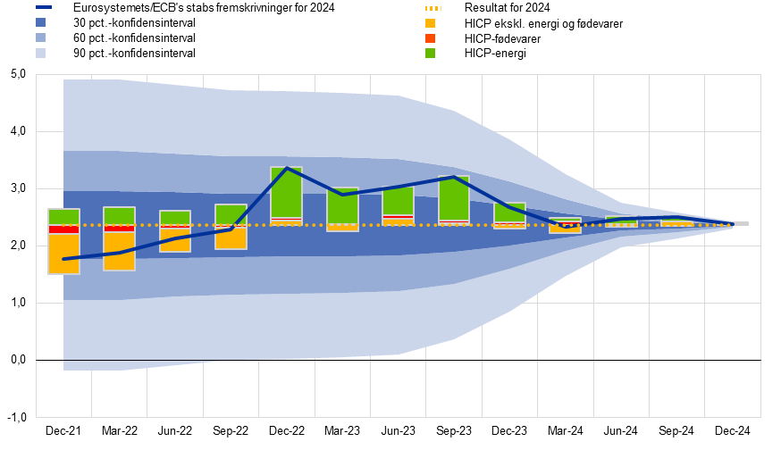 Anm.: Datoerne henviser til offentliggørelsen af hver tidsserie for prognosen. Den blå linje viser Eurosystemets/ECB's stabs fremskrivning for 2024 for den årlige inflation i de enkelte tidsserier. Søjlerne viser fordelingen af prognosefejlen efter inflationskomponent. De skraverede områder repræsenterer konfidensintervallerne på 30 pct., 60 pct. og 90 pct. baseret på tidligere inflationsfremskrivningsfejl, som er centreret omkring det endelige inflationsresultat for 2024, da de ville være blevet anslået på prognosetidspunktet. Yderligere oplysninger om metoden findes i boksen "Illustration af usikkerheden omkring fremskrivningerne" i ECB's stabs makroøkonomiske fremskrivninger for euroområdet fra marts 2023.
