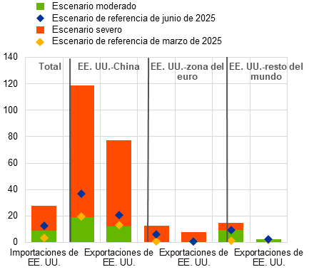 Al contrario que en el escenario de referencia y en el escenario moderado, en el escenario severo no se incluyen las exenciones arancelarias temporales. Por lo tanto, se considera que los bienes que gozan de exenciones temporales quedan sujetos a los tipos arancelarios generales de Estados Unidos anunciados el 2 de abril.