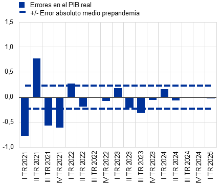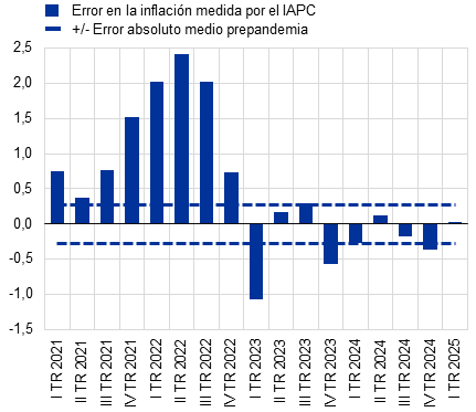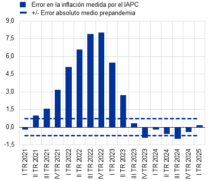 En resumen, la magnitud de los errores de predicción ha ido disminuyendo desde el segundo semestre de 2023 y las proyecciones de los expertos del Eurosistema/BCE han obtenido buenos resultados en general, pero la elaboración de previsiones sigue siendo complicada dadas las perturbaciones que continúan afectando a la zona del euro. Los errores fueron especialmente grandes en 2021 y 2022, como consecuencia del impacto de una serie de perturbaciones extraordinarias y solapadas. Desde entonces, la precisión de las previsiones ha mejorado, especialmente en el caso de la inflación, excluidos la energía y los alimentos, en consonancia con la desaparición gradual de estas perturbaciones. El caso de 2024 ilustra que, a pesar de algunas sobreestimaciones e infraestimaciones, los errores de proyección de la inflación han permanecido dentro de los intervalos normales en términos históricos. No obstante, la elaboración de previsiones sigue siendo muy complicada dadas las perturbaciones que continúan afectando a las perspectivas económicas tanto mundiales como de la zona del euro. Esto requiere una prudencia continua y agilidad en el proceso de previsión, en particular dada la elevada incertidumbre en torno a la evolución y la transmisión de esas perturbaciones.