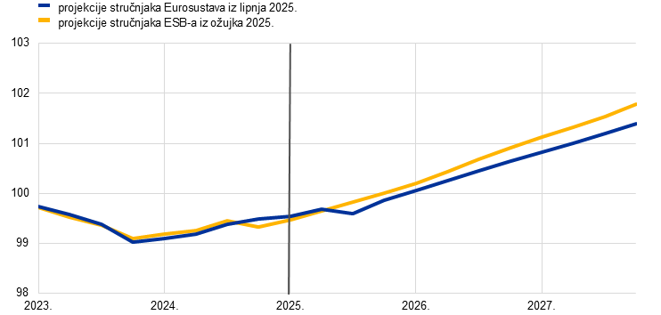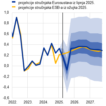 Projekcije stručnjaka Eurosustava iz lipnja 2025. unutar su raspona drugih prognoza rasta BDP‑a, ali uglavnom su niže za inflaciju mjerenu HIPC‑om. Za 2025. i 2027. projekcija stručnjaka Eurosustava koja se odnosi na rast u uskom je rasponu prognoza drugih institucija i anketa organizacija privatnog sektora, ali je nešto niža od raspona za 2026. Kada je riječ o inflaciji mjerenoj HIPC‑om, projekcija stručnjaka Eurosustava na dnu je raspona drugih prognoza za 2025. i niža je od raspona za 2026., vjerojatno zbog nedavno posuvremenjenih pretpostavki o cijenama energije i tečajnim kretanjima na kojima se temelje projekcije Eurosustava. Za 2027. projekcija stručnjaka Eurosustava u skladu je s drugim dostupnim prognozama. Projekcija stručnjaka Eurosustava za inflaciju mjerenu HIPC‑om bez energije i hrane nalazi se unutar raspona drugih prognoza za 2025. i 2026. i nešto je niža od druge prognoze dostupne za 2027.