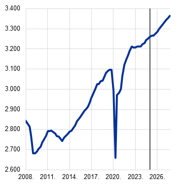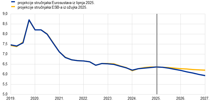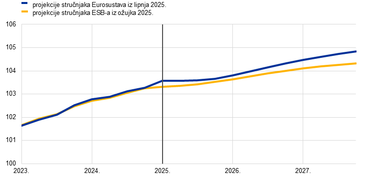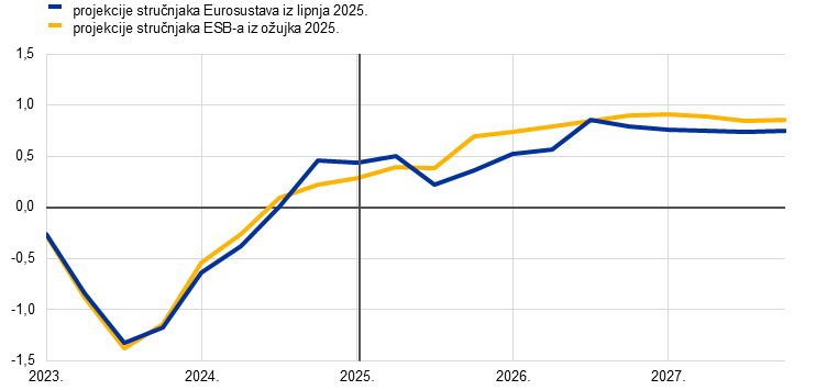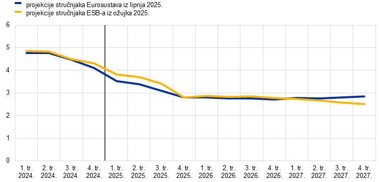 Očekuje se da će se ukupna inflacija mjerena harmoniziranim indeksom potrošačkih cijena (HIPC) u kratkoročnom razdoblju zadržati ispod 2 %, no da će se u srednjoročnom razdoblju vratiti na ciljnu razinu. Inflacija bi se tijekom 2025. trebala smanjivati i dosegnuti najnižu razinu od 1,4 % u prvom tromjesečju 2026., nakon čega bi se u 2027. trebala vratiti na 2,0 %. Predviđa se da će smanjenje ukupne inflacije u 2025. djelomično prouzročiti negativna stopa inflacije cijena energije nakon nedavnog pada cijena nafte i veleprodajnih cijena prirodnog plina. Očekuje se da će inflacija cijena energije ostati negativna do 2027., kada će na snagu stupiti mjere za ublažavanje klimatskih promjena povezane s novim sustavom za trgovanje emisijama (ETS2). Nakon privremenog povećanja u drugom tromjesečju 2025., inflacija cijena hrane trebala bi u 2027. pasti na stope neznatno više od 2 %. Očekuje se da će se inflacija mjerena HIPC‑om bez energije i hrane smanjiti pod utjecajem komponente usluga kako učinci odgođenog usklađivanja cijena pod nekim stavkama i pritisci plaća budu slabjeli te kako se niže cijene energije budu prenosile kroz cjenovni lanac. Rast plaća trebao bi se i dalje smanjivati kako se pritisci radi nadoknade pada realnih plaća budu smanjivali. To bi, zajedno s oporavkom rasta produktivnosti, trebalo dovesti do znatno sporijeg rasta jediničnih troškova rada. Očekuje se da će vanjski cjenovni pritisci, vidljivi iz uvoznih cijena, i dalje biti umjereni, pod pretpostavkom da carinske politike EU‑a ostanu nepromijenjene, pri čemu iz snažnijeg eura i pada cijene energenata u proteklim mjesecima proizlaze određeni pritisci na smanjenje inflacije. U odnosu na projekcije iz ožujka 2025. izgledi za ukupnu inflaciju mjerenu HIPC‑om revidirani su naniže za 0,3 postotna boda za 2025. i za 2026. zbog pretpostavki o nižim cijenama energenata i aprecijacije eura, a za 2027. nisu revidirani.