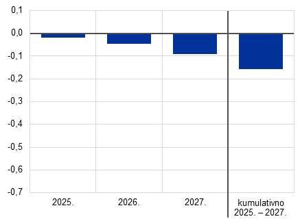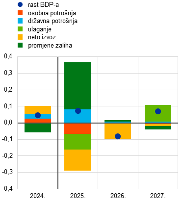 Pooštravanju u 2025. pridonijet će i daljnje smanjivanje preostalih mjera potpore povezanih s energijom u uvjetima daljnjeg rasta državne potrošnje i ulaganja te povećanja fiskalnih transfera. Popuštanje nediskrecijskih činitelja posljedica je manjka prihoda i drugog poreznog reziduala a kompozicijski učinci, koji su bili vrlo pozitivni u 2024., trebali bi biti neutralni i u 2025. i u preostalom dijelu projekcijskog razdoblja.
