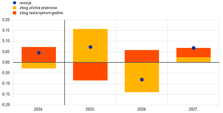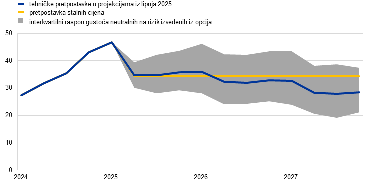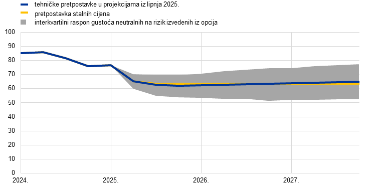 Napomene: Revizije su prikazane kao postotci za razine, kao postotni bodovi za stope rasta te kao postotci na godišnjoj razini. Za revizije stopa rasta i kamatnih stopa rabe se brojevi zaokruženi na jednu decimalu, dok se za revizije iskazane kao promjene u postotcima rabe nezaokruženi brojevi. Tehničke pretpostavke povezane s kamatnim stopama i cijenama sirovina u europodručju temelje se na tržišnim očekivanjima s krajnjim datumom 14. svibnja 2025. Cijene nafte odnose se na promptne i terminske cijene sirove nafte Brent. Cijene plina odnose se na promptne i terminske cijene plina na nizozemskoj platformi za trgovinu plinom Title Transfer Facility (TTF). Cijene električne energije odnose se na prosječnu veleprodajnu promptnu i terminsku cijenu u pet najvećih država europodručja. »Sintetička« terminska cijena emisijskih jedinica u sustavu ETS1 izvodi se linearnom interpolacijom kao vrijednost dviju najbližih ročnica emisijskih jedinica na europskoj burzi energije (engl. European Energy Exchange) na kraju mjeseca. Potom se izračunava prosjek mjesečnih cijena ročnica emisijskih jedinica kako bi se dobio godišnji ekvivalent. Budući da se još nije trgovalo emisijskim jedinicama u sustavu ETS2, stručnjaci Eurosustava pretpostavili su cijenu na razini praga iznad koje će se osloboditi dodatne emisijske jedinice, pri čemu je cijena prilagođena cijenama u 2027. (više pojedinosti može se pronaći u okviru Procjena utjecaja politika tranzicije povezanih s klimatskim promjenama na rast i inflaciju u Makroekonomskim projekcijama stručnjaka Eurosustava za europodručje iz prosinca 2024.). Kretanja cijena sirovina izvedena su iz kretanja na tržištima ročnica u deset radnih dana koji su prethodili krajnjem datumu. Pretpostavlja se da će bilateralni tečajevi tijekom projekcijskog razdoblja ostati nepromijenjeni na prosječnim razinama zabilježenima tijekom deset radnih dana koji su prethodili krajnjem datumu. Pretpostavke povezane s nominalnim prinosima na desetogodišnje državne obveznice u europodručju temelje se na prosječnom prinosu desetogodišnjih obveznica država, koji je ponderiran godišnjim BDP‑om. Ako postoje potrebni podatci, nominalni prinosi na desetogodišnje državne obveznice tih država definiraju se kao prinosi desetogodišnjih referentnih obveznica produljeni terminskim nominalnim prinosima koji su na krajnji datum izvedeni iz odgovarajućih krivulja prinosa za pojedinačne države. Za preostale države prinosi na desetogodišnje državne obveznice definirani su kao prinosi desetogodišnjih referentnih obveznica produljeni na osnovi konstantne razlike (zabilježene na krajnji datum) u odnosu na tehničku pretpostavku o nerizičnim dugoročnim kamatnim stopama u europodručju.