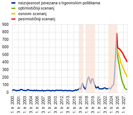 Iz viših carina SAD‑a, mogućih protumjera drugih država i neizvjesnosti povezane s trgovinskim politikama proizlaze znatni rizici za gospodarske izglede europodručja. U projekcijama iz lipnja 2025. pretpostavlja se da će carine tijekom projekcijskog razdoblja ostati na razini iz svibnja 2025. i da će neizvjesnost i dalje biti povećana, premda će se postupno smanjivati. U ovom se okviru razmatraju makroekonomski učinci tih pretpostavki na osnovni scenarij te u dvama alternativnim ilustrativnim scenarijima: (1) optimističnijem scenariju, u kojem se predviđaju niže carine i brže slabljenje neizvjesnosti povezane s trgovinskim politikama, i (2) pesimističnijem scenariju, u kojem se predviđaju više carine i dugotrajnija povećana neizvjesnost povezana s trgovinskim politikama.