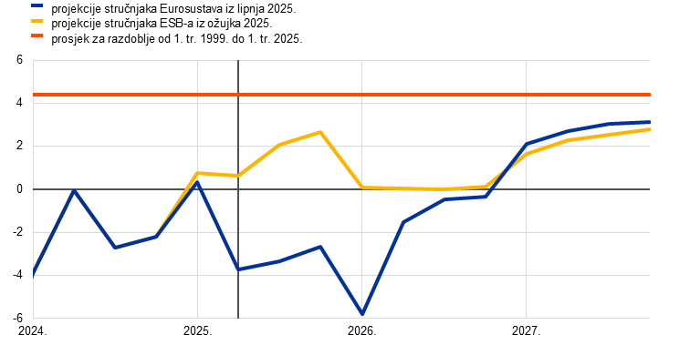 Izvori: OECD Economic Outlook, 3. lipnja 2025.; Ekonomska prognoza Europske komisije iz proljeća 2025., 19. svibnja 2025.; Consensus Economics Forecasts, 12. svibnja 2025. (podatci za 2027. uzeti su iz ankete iz siječnja 2025.); ESB‑ova Anketa o prognozama stručnjaka, 22. travnja 2025.; IMF World Economic Outlook, 22. travnja 2025.