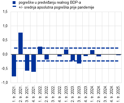 Od početka pandemije bolesti COVID‑19 točnost projekcija rasta BDP‑a europodručja bila je promjenjiva. Kratkoročne projekcije uglavnom su bile točne, ali tempo oporavka u srednjoročnom razdoblju često je bio precijenjen (Grafikon A). Tijekom pandemije, do kraja 2021., i kratkoročne i srednjoročne projekcije sadržavale su neuobičajeno velike pogreške, što potvrđuje činjenicu da je predviđanje rasta bilo otežano u razdoblju dotad nezabilježenih mjera zatvaranja i ponovnog otvaranja. Pogreške u kratkoročnim projekcijama znatno su se smanjile nakon 2022. i otada su ostale niže od ili blizu srednje apsolutne vrijednosti pogrešaka zabilježenih prije pandemije. To upućuje na zaključak da su, čak i u uvjetima višestrukih velikih šokova, nedavne kratkoročne projekcije rasta BDP‑a uglavnom bile pouzdane, bez očite tendencije podcjenjivanja ili precjenjivanja. Međutim, u srednjoročnim projekcijama rast se sustavno precjenjivao od trećeg tromjesečja 2022. do drugog tromjesečja 2024., pri čemu su od četvrtog tromjesečja 2022. do četvrtog tromjesečja 2023. pogreške za jednu godinu unaprijed prelazile srednje apsolutne pogreške zabilježene prije pandemije. Ta su precjenjivanja ukazivala na optimistična očekivanja o snazi oporavka nakon energetske krize. Pogreške su u 2022. bile prije svega potaknute neočekivano slabim oporavkom globalne trgovine, višim cijenama energije, strožim uvjetima financiranja i povećanom neizvjesnošću, čemu je pridonio i podcijenjeni učinak inflacije na realne dohotke. U 2023. neočekivano slaba inozemna potražnja, restriktivnija monetarna politika i jači euro pridonijeli su manjem rastu od predviđenog.[14] Točnost projekcija za jednu godinu unaprijed znatno se poboljšala tijekom prošle godine, premda je i dalje prisutna sklonost blagom precjenjivanju snage izgleda za rast.