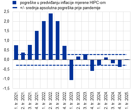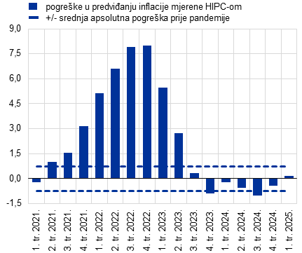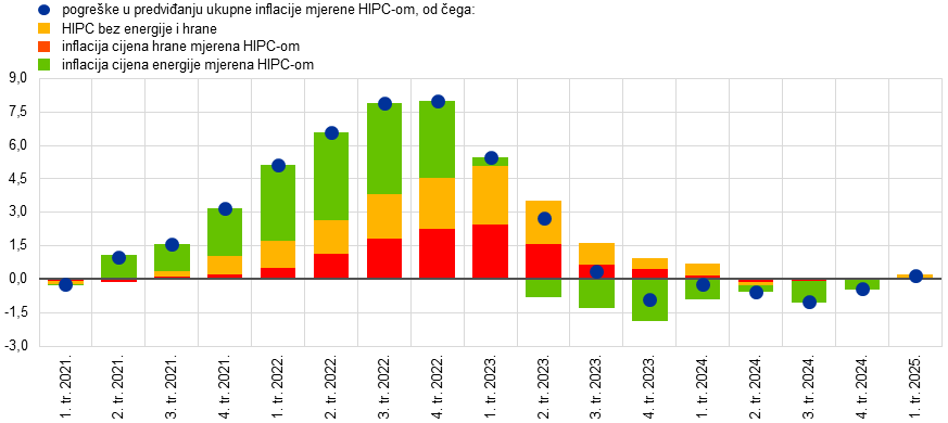 Ukratko, pogreške u projekcijama smanjile su se od druge polovice 2023., pri čemu su projekcije stručnjaka Eurosustava/ESB‑a općenito bile uspješne, ali predviđanje inflacije i dalje je otežano zbog kontinuiranih šokova koji utječu na europodručje. Pogreške su bile posebno velike u 2021. i 2022., što je posljedica izvanrednih šokova i šokova koji se preklapaju. Otada se točnost prognoza poboljšala, posebno kada je riječ o inflaciji bez energije i hrane, što je u skladu s postupnim smanjenjem šokova. Primjer inflacije u 2024. pokazuje da su, unatoč određenim precjenjivanjima i podcjenjivanjima, pogreške u projekcijama inflacije ostale unutar uobičajenih povijesnih granica. Ipak, predviđanje je i dalje vrlo teško s obzirom na trenutačne šokove koji utječu na gospodarske izglede na globalnoj razini i u europodručju. Stoga su potrebni stalan oprez i prilagodljivost u predviđanju, posebno u uvjetima velike neizvjesnosti povezane s kretanjem i transmisijom tih šokova.