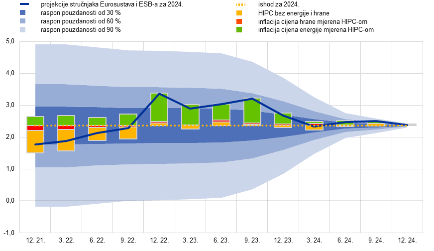 Napomene: Datumi se odnose na pojedinačne objave projekcija. Plava linija prikazuje projekciju stručnjaka Eurosustava/ESB‑a za godišnju inflaciju za 2024. u svakoj objavi. U stupcima su raščlanjene pogreške u prognozi prema komponenti inflacije. Osjenčani su rasponi pouzdanosti od 30 %, 60 % i 90 % na temelju pogrešaka u prošlim projekcijama inflacije, raspoređene oko konačne stvarne inflacije u 2024., kako bi bili procijenjeni u trenutku pojedinačnih projekcija. Više informacija o metodologiji može se pronaći u okviru Prikazivanje neizvjesnosti povezane s projekcijama u Makroekonomskim projekcijama stručnjaka ESB‑a za europodručje iz ožujka 2023.