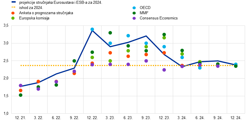 Projekcije stručnjaka Eurosustava/ESB‑a koje se odnose na godišnje prosječne stope inflacije mjerene HIPC‑om za 2024. u različitim objavama
