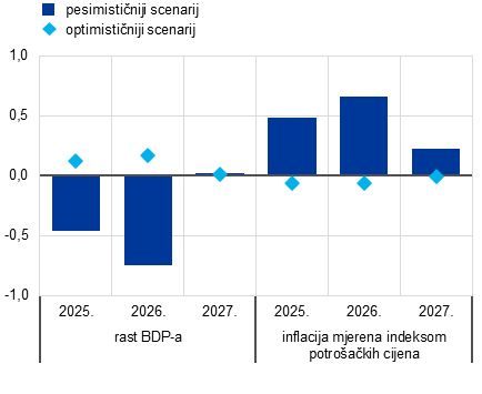 Za razliku od osnovnog i optimističnijeg scenarija, u pesimističniji scenarij nisu uvrštena privremena izuzeća od carina nego se pretpostavlja da će i roba na koju se primjenjuju privremena izuzeća podlijegati općim carinskim stopama SAD‑a najavljenima 2. travnja.