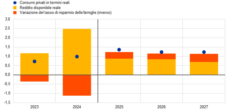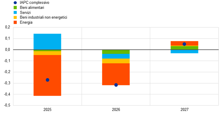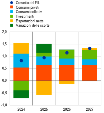 10. Una fonte aggiuntiva di inasprimento nel 2025 è costituita dall’ulteriore ridimensionamento delle restanti misure di sostegno connesse all’energia, mentre i consumi e gli investimenti delle amministrazioni pubbliche continuano a espandersi e i trasferimenti fiscali registrano un aumento. L’effetto di allentamento esercitato dai fattori non discrezionali è dovuto a minori entrate e ad altri residui fiscali, mentre gli effetti di composizione, che erano fortemente positivi nel 2024, sarebbero neutri sia nel 2025 sia nel resto del periodo in esame.