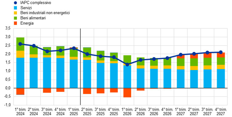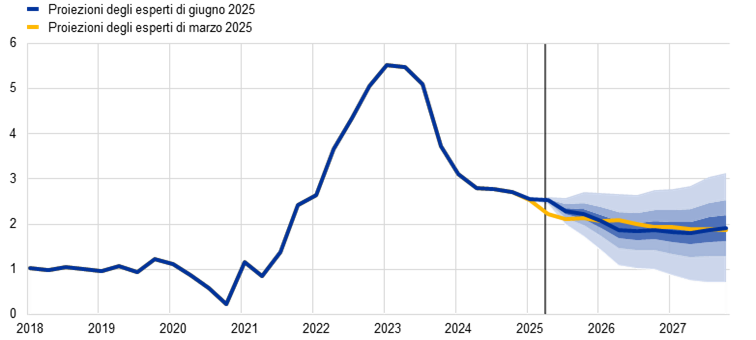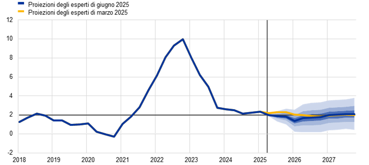 L’inflazione complessiva, misurata sull’indice armonizzato dei prezzi al consumo (IAPC), resterà probabilmente al di sotto del 2% nel breve periodo, ma dovrebbe tornare all’obiettivo nel medio termine. In base alle proiezioni, l’inflazione si ridurrebbe nel corso del 2025 e raggiungerebbe il minimo dell’1,4% nel primo trimestre del 2026, per poi riportarsi al 2,0% nel 2027. La diminuzione dell’inflazione complessiva nel corso del 2025 sarebbe in parte riconducibile a tassi negativi dell’inflazione per i beni energetici in seguito al recente calo dei corsi petroliferi e dei prezzi all’ingrosso del gas naturale. Ci si aspetta che l’inflazione resti negativa per la componente energetica fino a 2027, quando entreranno in vigore nuove misure di mitigazione del cambiamento climatico nell’ambito del nuovo sistema dell’UE per lo scambio di quote di emissione (ETS2). Dopo un temporaneo incremento nel secondo trimestre del 2025, l’inflazione dei beni alimentari si dovrebbe ridurre portandosi leggermente al di sopra del 2% nel 2027. L’inflazione misurata sullo IAPC al netto dei beni energetici e alimentari (HICPX) dovrebbe registrare una diminuzione, riconducibile alla componente dei servizi, via via che si esauriscono gli effetti degli aggiustamenti di prezzo ritardati per alcune voci, si attenuano le pressioni salariali e il calo delle quotazioni energetiche si trasmette lungo la catena di formazione dei prezzi. La crescita salariale continuerebbe a mostrare un profilo discendente con il venir meno delle spinte al recupero delle passate perdite di reddito reale. Assieme a una ripresa della crescita della produttività, ciò dovrebbe determinare un rallentamento significativo del costo del lavoro per unità di prodotto. Le pressioni esterne sui prezzi, riflesse nei prezzi all’importazione, rimarrebbero moderate nell’ipotesi che l’UE mantenga invariate le proprie politiche tariffarie, a fronte di alcune spinte al ribasso derivanti dall’apprezzamento dell’euro e dal calo dei prezzi delle materie prime energetiche negli ultimi mesi. Rispetto alle proiezioni di marzo 2025, le prospettive per l’inflazione complessiva misurata sullo IAPC sono state riviste al ribasso di 0,3 punti percentuali sia per il 2025 sia per il 2026, per effetto di ipotesi di prezzi più bassi delle materie prime energetiche e del rafforzamento dell’euro, mentre non vi sono state correzioni per il 2027.