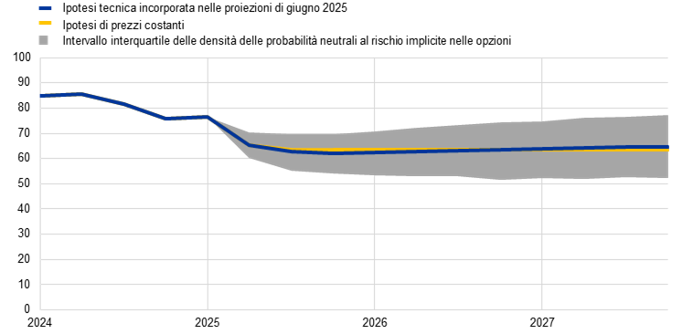Rispetto all’esercizio dello scorso marzo, le principali modifiche apportate alle ipotesi tecniche sono rappresentate da prezzi delle materie prime notevolmente più bassi, da un significativo rafforzamento del tasso di cambio e da tassi di interesse a lungo termine più elevati. Le ipotesi concernenti i corsi del petrolio sono state riviste al ribasso di quasi l’11% per il periodo 2025-2026, con un ulteriore calo delle quotazioni nel breve periodo e un successivo aumento lieve a partire dagli inizi del 2026, il che implica pressioni al rialzo sull’inflazione nel 2027. L’ipotesi relativa ai prezzi all’ingrosso del gas è stata corretta verso il basso del 24,4% per il 2025, del 17,6% nel 2026 e del 7,7% nel 2027. L’euro si è apprezzato dell’8,3% sul dollaro statunitense e del 3,9% in termini effettivi nominali rispetto all’esercizio previsivo precedente. Le ipotesi per i tassi di interesse a breve termine sono sostanzialmente invariate, mentre quelle riguardanti i tassi a lungo termine sono state riviste verso l’alto di circa 30-40 punti base in media nel periodo 2025-2027.