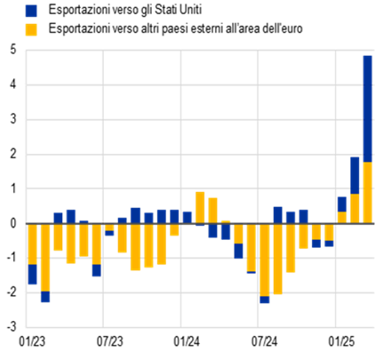 I rischi che caratterizzano lo scenario di base sono strettamente connessi agli andamenti delle politiche commerciali e alla relativa incertezza. Un aumento dei dazi da parte degli Stati Uniti seguito dall’attuazione di misure ritorsive da parte dei partner commerciali potrebbe frenare l’attività economica mondiale, e quindi la domanda esterna dell’area dell’euro, e far aumentare l’inflazione. Per contro, l’esito positivo dei negoziati tra l’amministrazione statunitense e i suoi partner commerciali potrebbe portare a un abbassamento dei dazi, sostenendo la crescita e attenuando le pressioni inflazionistiche negli Stati Uniti. Una recessione in tale paese comporterebbe ricadute negative sulla crescita in altre economie e ridurrebbe le pressioni inflazionistiche nell’economia mondiale. Per ulteriori dettagli in merito all’impatto di scenari alternativi, cfr. il riquadro 2.