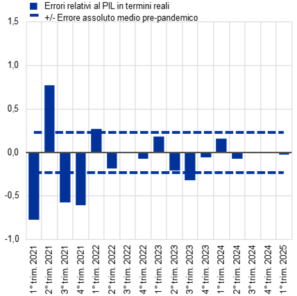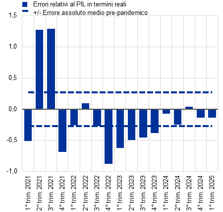 Nota: si definisce errore la differenza tra il valore effettivo osservato in un determinato trimestre e la proiezione elaborata quattro trimestri prima (ad esempio, la differenza tra il dato in tempo reale del quarto trimestre del 2022 e quello previsto nelle proiezioni macroeconomiche degli esperti dell’Eurosistema di dicembre 2021).