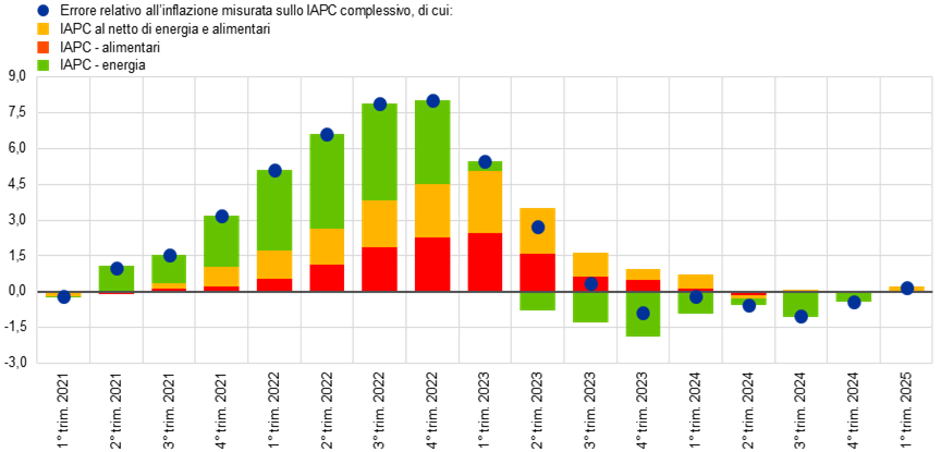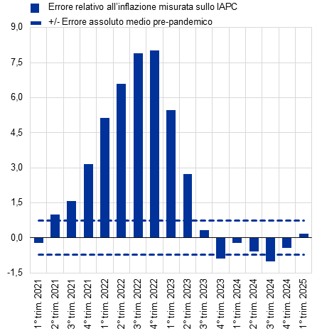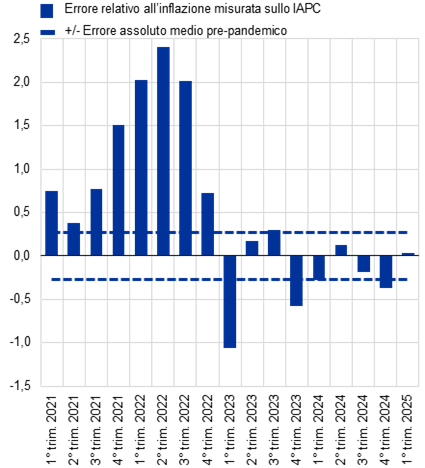 In sintesi, gli errori di proiezione si sono ridotti dalla seconda metà del 2023 e la capacità predittiva delle proiezioni degli esperti dell’Eurosistema e della BCE è stata complessivamente buona; la formulazione di previsioni rimane tuttavia difficoltosa dati i perduranti shock che colpiscono l’area dell’euro. Gli errori sono stati particolarmente ampi nel 2021 e nel 2022, di riflesso all’impatto di shock straordinari e sovrapposti. Successivamente l’accuratezza delle previsioni è migliorata, specie per l’inflazione al netto dei beni energetici e alimentari, in linea con il graduale venir meno di questi shock. Il caso del 2024 mostra che, nonostante lievi sovra e sottostime, gli errori di proiezione dell’inflazione sono rimasti entro limiti storicamente normali. Ciò detto, la formulazione di previsioni rimane estremamente difficile, dati i perduranti shock che incidono sulle prospettive economiche a livello sia mondiale sia di area dell’euro. Questo richiede costante cautela e agilità nel processo di previsione, particolarmente a fronte dell’incertezza elevata che caratterizza l’evoluzione e la trasmissione di tali shock.