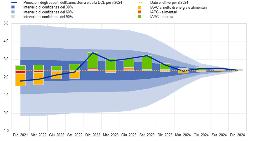 Nota: le date si riferiscono alla pubblicazione di ciascun esercizio previsivo. La linea blu mostra la proiezione degli esperti dell’Eurosistema e della BCE per l’inflazione annua nel 2024 in ciascun esercizio previsivo. Gli istogrammi scompongono l’errore di previsione per componente dell’inflazione. Le aree ombreggiate rappresentano intervalli di confidenza del 30%, del 60% e del 90% sulla base dei passati errori di proiezione dell’inflazione, posizionati intorno al tasso effettivo di inflazione per il 2024, come sarebbero stati stimati al momento dell’esercizio. Per maggiori dettagli sulla metodologia, cfr. il riquadro “Un’illustrazione dell’incertezza che caratterizza le proiezioni” delle Proiezioni macroeconomiche per l’area dell’euro formulate dagli esperti della BCE, marzo 2023.
