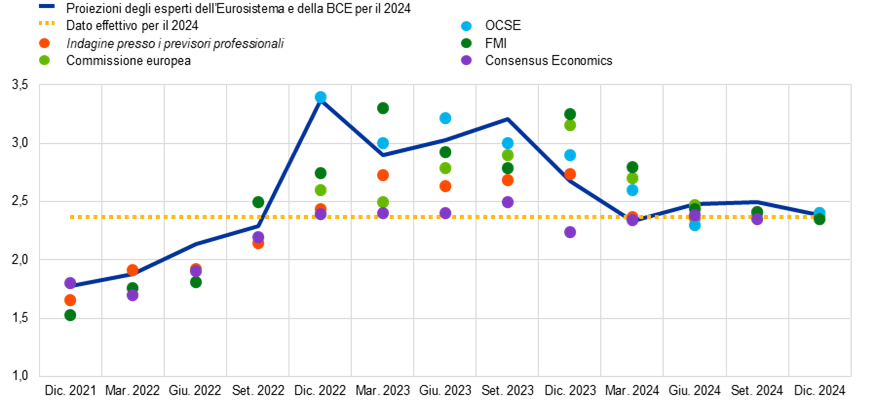 Proiezioni degli esperti dell’Eurosistema e della BCE per l’inflazione media annua misurata sullo IAPC nel 2024 in diversi esercizi previsivi