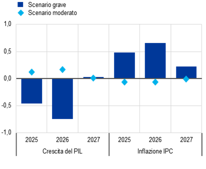 Al fine di illustrare i rischi connessi alle politiche tariffarie statunitensi e all’attuale elevata incertezza circa le prospettive economiche dell’area dell’euro, sono stati elaborati due scenari. Uno scenario moderato prevede la rimozione delle tariffe bilaterali tra gli Stati Uniti e l’UE (“zero per zero” tariffe) e una rapida riduzione dell’incertezza delle politiche commerciali ai livelli anteriori al 2018. In tale scenario, la crescita sarebbe più forte di 0,3-0,4 punti percentuali nel periodo 2025-2026 rispetto allo scenario di base, mentre l’inflazione sarebbe lievemente più elevata nel 2026-2027. Uno scenario grave prevede invece un ulteriore aumento generalizzato dei dazi statunitensi (in linea con l’annuncio dei cosiddetti dazi “reciproci” negli Stati Uniti), ritorsioni simmetriche da parte dell’UE e una sempre più elevata incertezza delle politiche commerciali. In tale scenario, le prospettive di crescita sarebbero considerevolmente più deboli sull’intero periodo di proiezione, mentre l’inflazione risulterebbe inferiore, soprattutto più avanti nell’orizzonte di riferimento. Tali scenari sono illustrati in dettaglio nel riquadro 2.