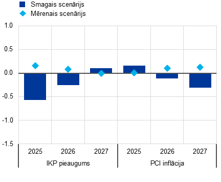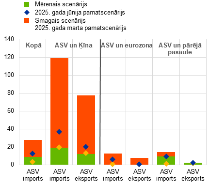 Lai ilustrētu ASV tarifu politikas radītos riskus un pašreizējo lielo nenoteiktību, kas saistīta ar eurozonas tautsaimniecības perspektīvu, sagatavoti divi scenāriji. Mērenais scenārijs paredz ASV un ES divpusējo tarifu atcelšanu (t. i., nulles līmeņa tarifus) un tirdzniecības politikas nenoteiktības strauju samazināšanos līdz līmenim, kāds bija pirms 2018. gada. Saskaņā ar šādu scenāriju izaugsme 2025. un 2026. gadā ir par 0.3–0.4 procentu punktiem spēcīgāka nekā pamatscenārijā, savukārt inflācija 2026. un 2027. gadā ir tikai nedaudz augstāka. Smagais scenārijs paredz turpmāku ASV tarifu palielināšanos visās jomās (atbilstoši ASV paziņojumam par tā dēvētajiem atbildes tarifiem), simetriskiem ES pretpasākumiem un ilgstoši pieaugošu tirdzniecības politikas nenoteiktību. Šādā scenārijā izaugsmes perspektīva visā iespēju aplēšu periodā ir daudz vājāka, savukārt inflācija ir zemāka, īpaši vēlāk iespēju aplēšu periodā. Šie scenāriji sīkāk aprakstīti 2. ielikumā.