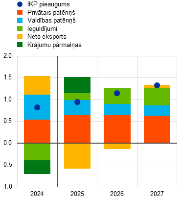 Avoti: OECD Tautsaimniecības perspektīvas, 2025. gada 3. jūnijs; Eiropas Komisijas 2025. gada pavasara ekonomiskās prognozes, 2025. gada 19. maijs; Consensus Economics prognozes, 2025. gada 12. maijs (2027. gada dati ņemti no 2025. gada janvāra apsekojuma); ECB aptauja Survey of Professional Forecasters, 2025. gada 22. aprīlis; SVF Pasaules tautsaimniecības perspektīva, 2025. gada 22. aprīlis.
