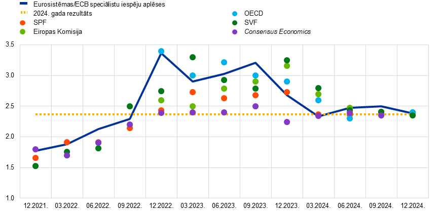Aptauja Survey of Professional Forecasters | 2025. gada aprīlis | 0.9 | 1.2 | 1.4 | 2.2 | 2.0 | 2.0 | 2.3 | 2.1 | 2.1 | |||